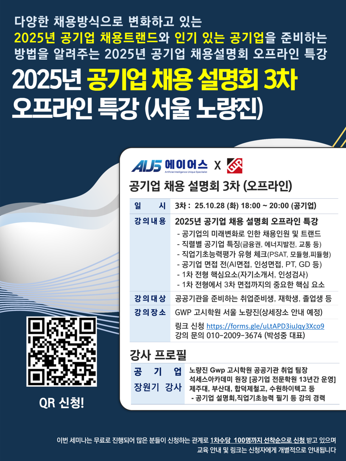 졸업한지 어언 2년이 다되가네요. 대학생때부터 공기업 관련 강의를 많이 들어봤지만 돌이켜보면 실질적으로 도움이 된 강의는 별로 없었던거 같아요. 하지만 졸업 후 그런 강의조차 들을 수 있는 기회는 주어지지 않았어요., (주륵) 그러던중 친언니가 에어어스 2021년 공기업 채용트랜드 온라인 특강 링크를 알려줘서 신청했습니다. 장원기 강사님께서 강의 중 보여주신 자료들과 해주신 말씀 하나하나 다 실질적으로 도움되는 말들이여서 도움이 됐습니다. 특히 직군별 공기업 시험 유형과 어떤 부분을 타겟으로 공부해야 하는지 알려주시고 공부도 전략이라는 것을 일깨워주셨네요! 여태 궁금했던 점도 해결할 수 있어서 좋았던거 같습니다. 요새 슬럼프였는데 이 강의를 통해 마음을 다시 잡을 수 있었습니다! 감사합니다. :)