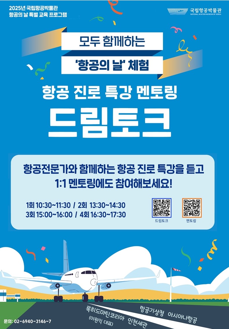국립항공박물관은 2025년 항공의 날을 맞이하여 중·고등학생 및 항공 관련 학과 재학생을 대상으로 항공진로체험교육 ‘드림토크(Dream-Talk)’를 진행합니다. 관련하여 관심 있는 학생들의 많은 지원바랍니다.