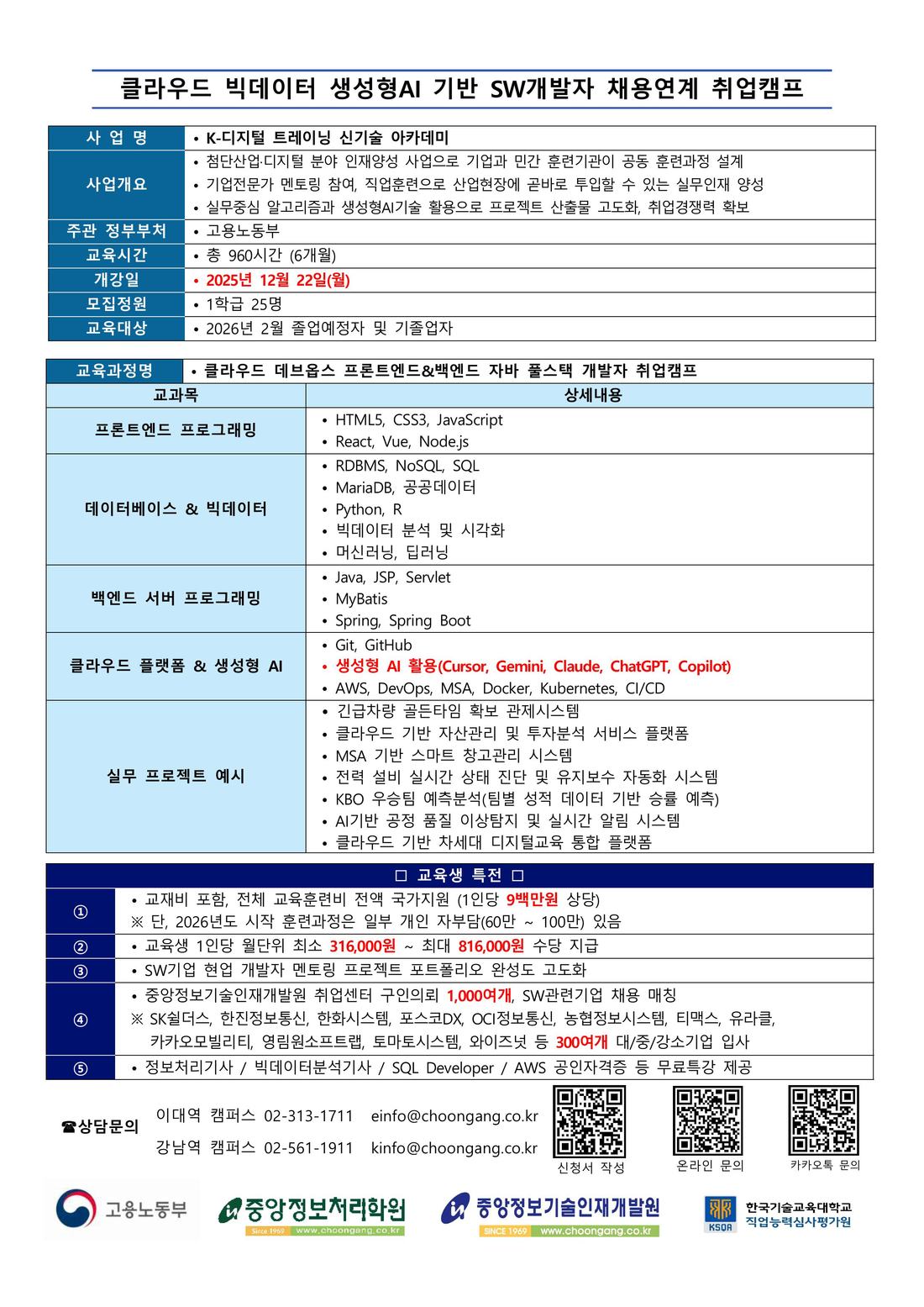 [중앙정보기술인재개발원] 클라우드 빅데이터 생성형AI 기반 SW개발자 과정_고용노동부 위탁 채용연계 SW캠프 교육생 모집안내