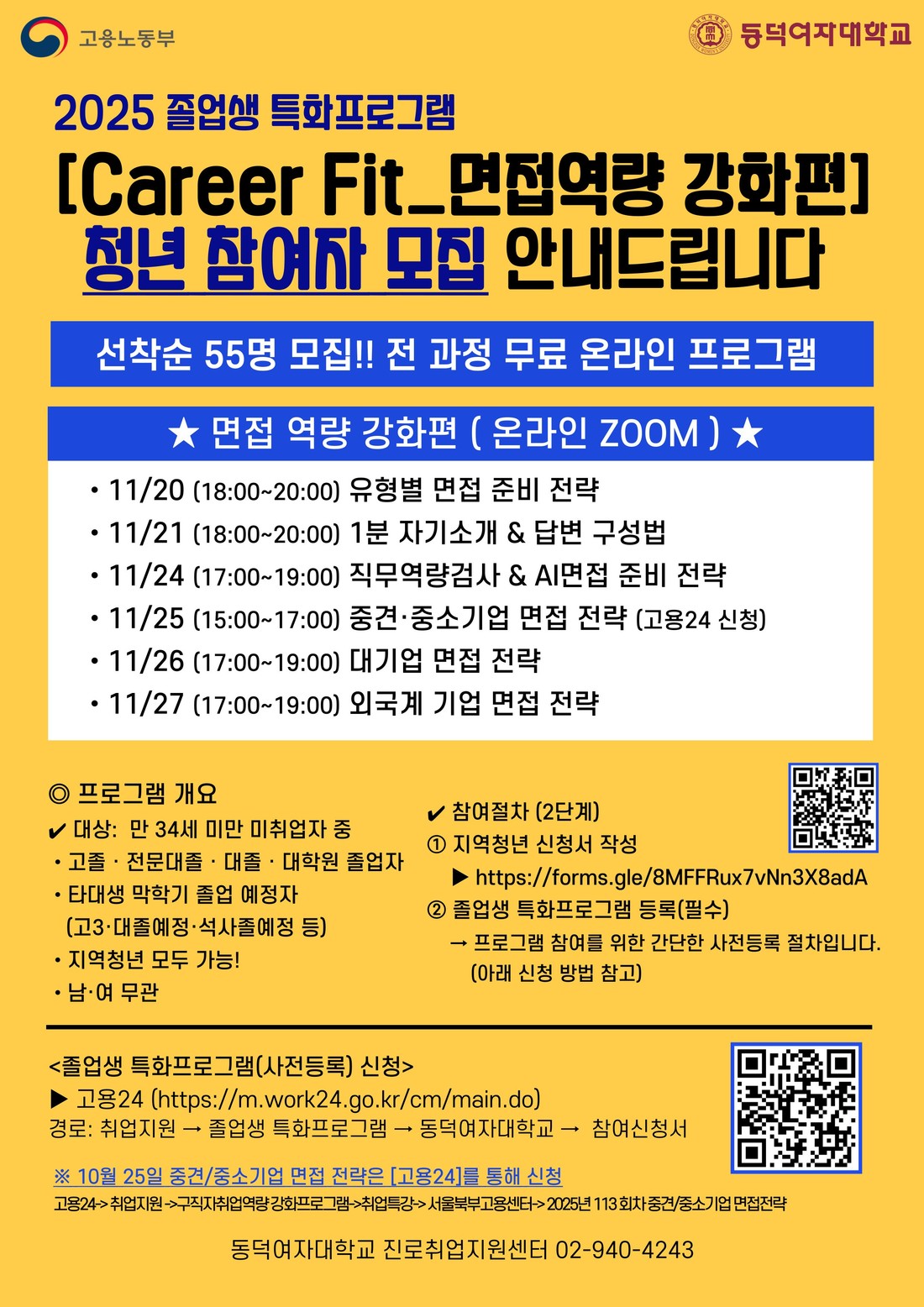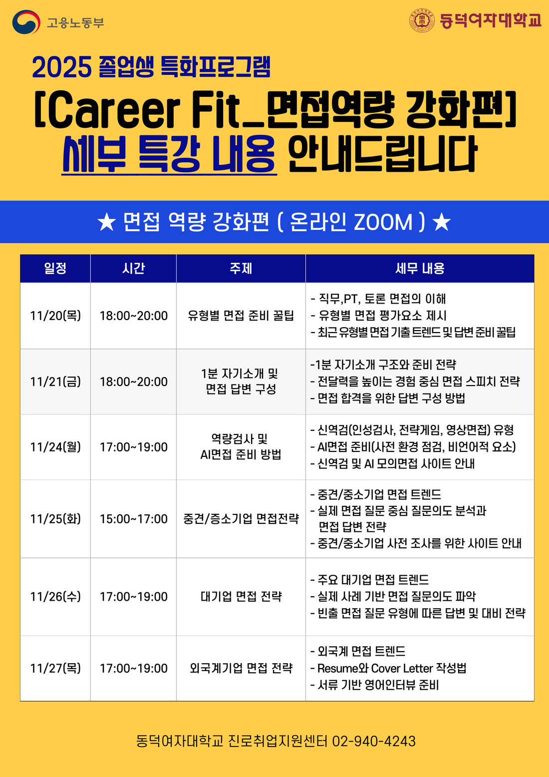 동덕여자대학교에서는 졸업생 특화프로그램 사업의 일환으로 'Career Fit_면접역량 강화편'을 운영합니다. 면접에 관한 특강 시리즈로 진행되는 이번 특강에 관심있는 학생들의 많은 참여 바랍니다.