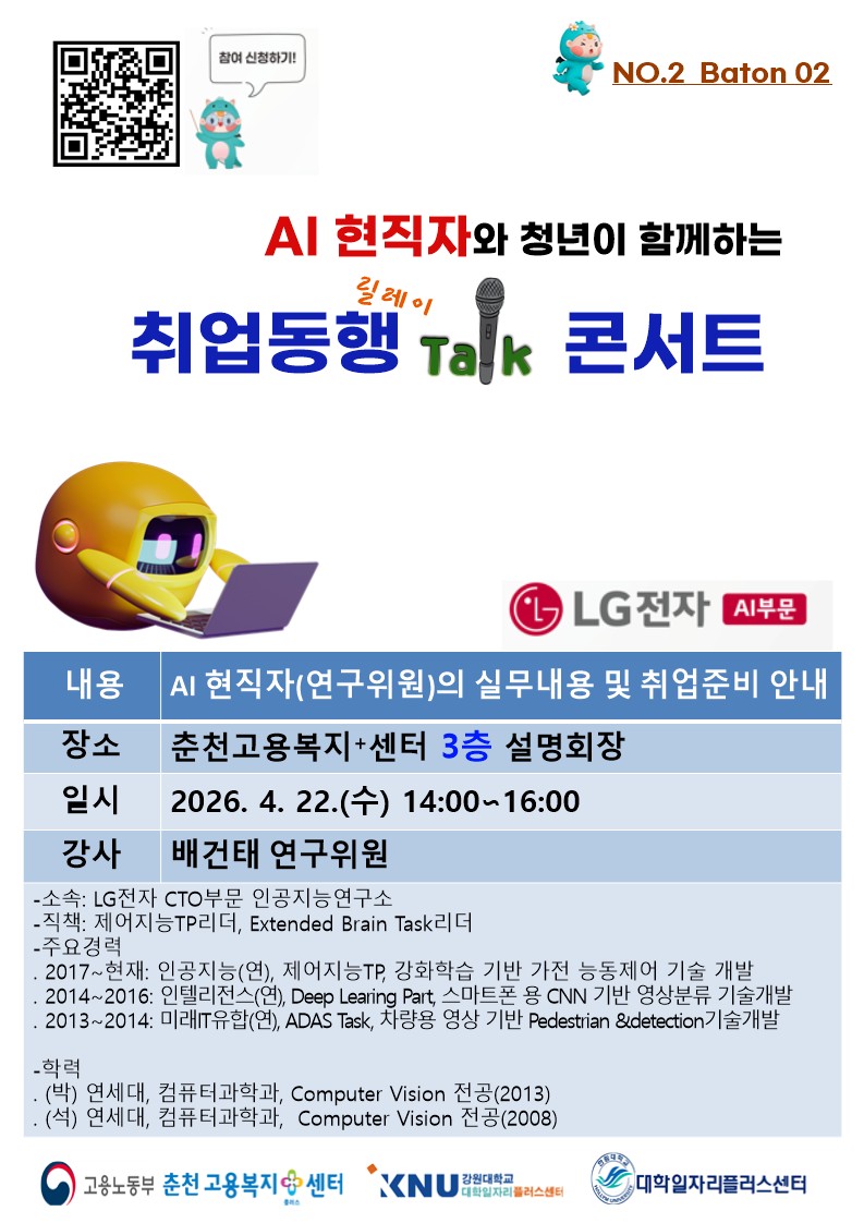 춘천고용센터에서는 ‘LG전자 AI연구위원'의 '직무내용과 취업준비'를 주제로 현직자 토크콘서트를 진행합니다.